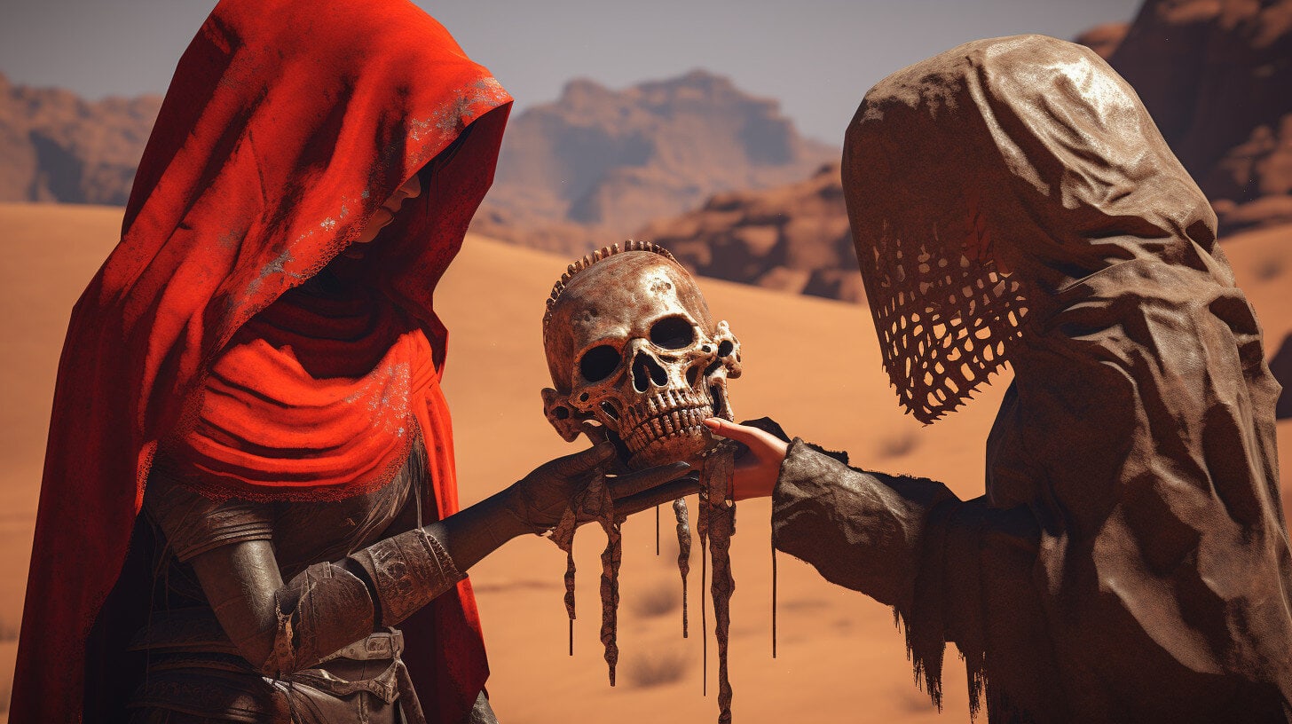 Ein Pilger, der dem Ruf des Schädelgottes gefolgt ist, machte an unserer heiligen Stätte Halt. Als er bedauerlicherweise keinen Schädel im Inventar hatte, trat Schwester Clown mit einer großzügigen Geste ein. Sie überreichte ihm eine Schale schmerzlos und schnell wirkendes Gift.